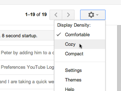 Considerando la mole di dispositivi e schermi dai quali si accede al servizio il Team dei progettisti ha ideato questa interessantissima funzione che permette di avere sempre una visualizzazione ottimale della propria casella di posta, in qualunque modo si scali la finestra sul contenuto. Il Setting menù permette inoltre di settare alcune modalità pre-impostate: Comfortable, Cozy e Compact.