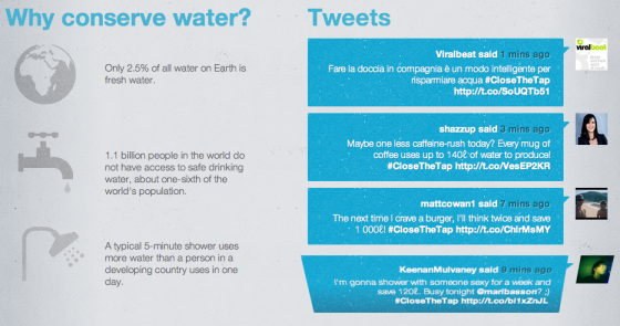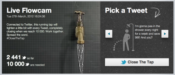 Per sollevare ancora una volta l’attenzione attorno al tema dello spreco di acqua potabile è stato creato un sito www.closethetap.co.za in cui viene ripreso un rubinetto d’acqua che scorre. Il sito è collegato a Twitter, e una volta raggiunto dall’utente questi viene sollecitato ad inviare un tweet utile a diminuire il flusso dell’acqua. Il tweet deve riguardare un pensiero o suggerimento su come risparmiare acqua, inserendo l’hashtag #CloseTheTap. Inoltre, per coloro che non hanno un suggerimento pronto per essere twittato, il bottone Close The Tap creerà un tweet pre-impostato per rendere lo share ancora più facile.
