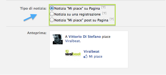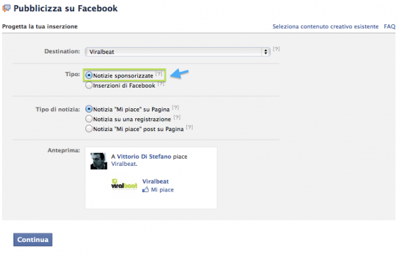 In funzione del tipo di destinazione che avete scelto per la vostra Sponsored Story, troverete una serie di opzioni per la creazione della Notizia. Per la Pagina Facebook di Viralbeat, abbiamo scelto la Notizia “Mi Piace” su Pagina; in basso ne possiamo vedere un’anteprima.