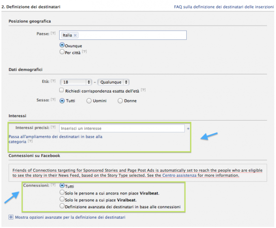 In questa schermata dovremo indicare i criteri di definizione dei destinatari: oltre ad una targetizzazione per posizione geografica ed età, potremmo profilare la nostra audience attraverso l’uso di keyword specifiche inserendole nel campo interessi precisi e scegliere gli utenti che visualizzeranno la notizia sponsorizzata nel proprio news feed in funzione del tipo di legame che ci connette a loro (fan, amici dei fan, ecc.).
