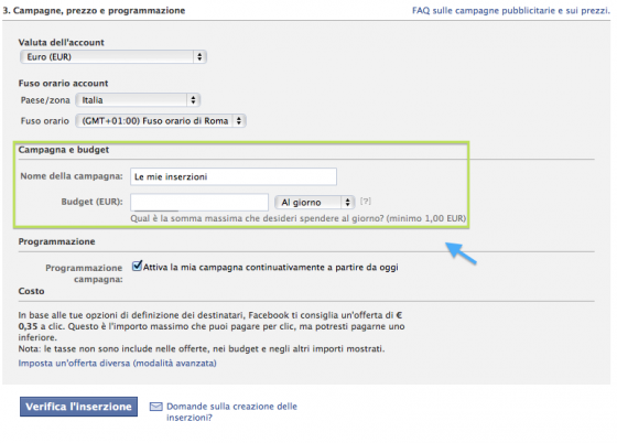 Infine nel passaggio 5, non ci resta che inserire la cifra che vogliamo investire nella nostra campagna di notizie sponsorizzate, la durata e da quando deve partire.
