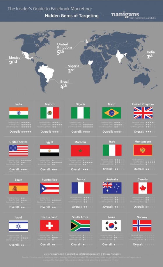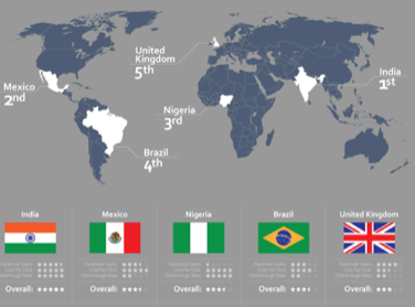 A quanto pare il paese più vantaggioso su cui investire tramite il social network di Zuckerberg è l’India, seguita da Messico e Nigeria. L’ Italia è al 9° posto con una “pagella” non proprio entusiasmante.