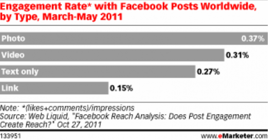 La ricerca mostra che i post page che presentano delle foto hanno un engagement-rate del 0,37% , superiore a quella di page post con video (0,31%). I soli messaggi di testo invece ottengono lo 0,27% e i link lo 0,15%.
