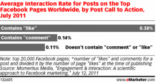 Momentus Media, società che fornisce software di analisi, ha individuato che gli status che contengono call-to-action legate alle parole “Like” e “Comment” aumentano le performance di questi post rispetto a quelli che non le includono. Nella fattispecie i post contenenti la parola “Like” hanno un tasso di engagement dello 0,38% , quello con la parole “Comment” un tasso dello 0,14%, infine per i post che non presentano nessuna delle due parole il grado di coinvolgimento generato è pari allo 0,11%.