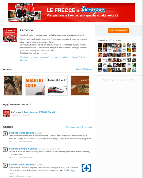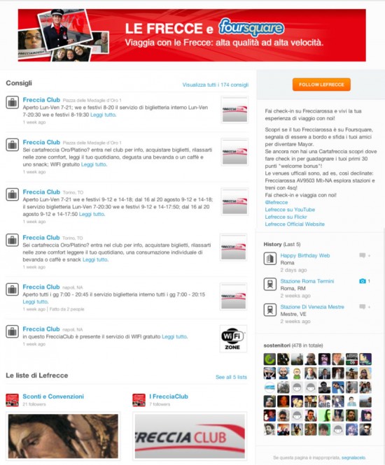 Come potete vedere nelle immagini sotto riportate, sono presenti due schermata della Business Page di Le Frecce la Foursquare Page realizzata da Trenitalia. Nella vecchia versione possiamo osservare come la personalizzazione è limitata a un banner posizionato in alto nell’Header della Pagina, mentra al centro nel corpo principale trovano posto i consigli. Più avanti sotto troviamo le liste e una breve descrizione che indica quanti follower ci sono per lista, nella colonna di destra infine abbiamo il tasto per fare il follow del brand, un elenco dei check-in e le mini-icon dei follower.