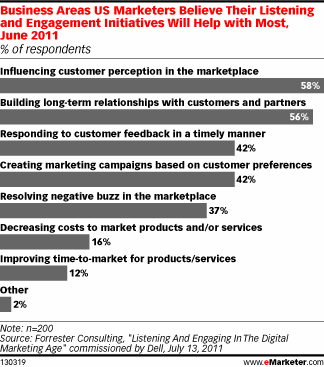 Sono molte le marche che, in linea con queste nuove esigenze espresse dagli utenti, hanno iniziato ad adoperare servizi di Customer Care su Twitter rispondendo agli utenti, con l’obiettivo di costruire e alimentare una buona brand reputation e innescare relazioni importanti e di lunga durata con i clienti. Secondo un report sui social media di Forrester Consulting per DELL, è emerso che il 58% dei Marketers americani credono che l’ascolto ed il coinvolgimento dei consumatori attraverso i media digitali aiuterà la brand reputation che i clienti hanno del loro marchio. Inoltre, il 56% ha dichiarato che i loro sforzi nei social media saranno di aiuto nella costruzione di relazioni a lungo termine dei clienti.