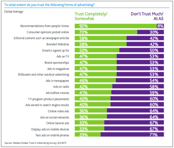 Il sondaggio svolto da Nielsen sul Global Trust in Advertising è stato condotto tra agosto e settembre 2011 e pubblicato lo scorso aprile. Ha coinvolto 28,000 consumatori online, in 56 paesi in tutti e cinque i continenti.