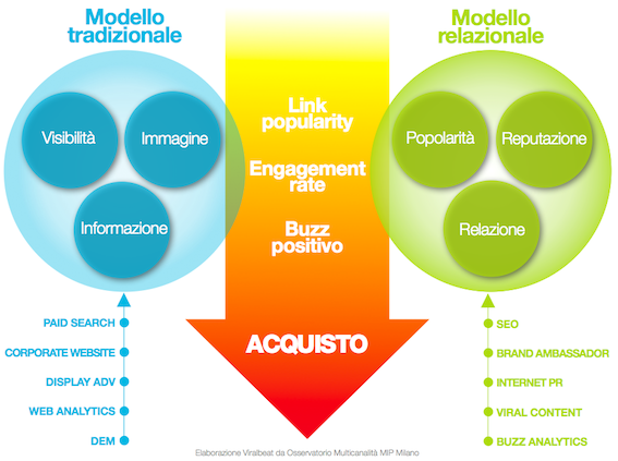 2) il modello relazionale dell’informazione che poggia sul concetto di relazione con i propri pubblici, sulla reputazione effettiva del brand (o prodotto o servizio) online e sulla sua popolarità: Search Engine Optimization (SEO), brand ambassador, internet PR, viral content, buzz analytics.