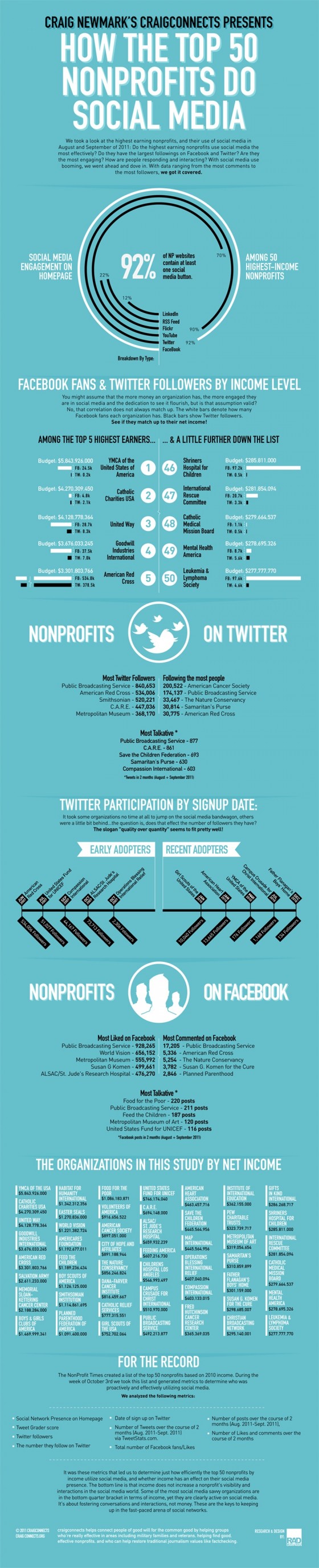 Infine l’organizzazione con il più alto reddito netto è l’YMCA, ha pubblicato solo 19 post su Facebook in 2 mesi, ma ha oltre 24.000 fan, gli altri dati della ricerca nella infografica di oggi.