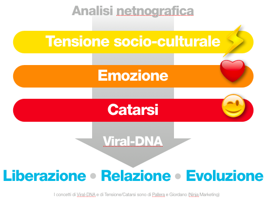 L’analisi dei trend culturali emergenti fornisce invece importanti informazioni relative ai codici espressivi ed alle dinamiche tribali ricorrenti in un determinato pubblico di riferimento. Riconoscere questi punti cardine è la chiave per sviluppare una campagna virale di successo, in grado di scardinare i punti sensibili della comunicazione e permettere così di diffondersi spontaneamente: è il punto di partenza per progettare il viral DNA di una campagna.
