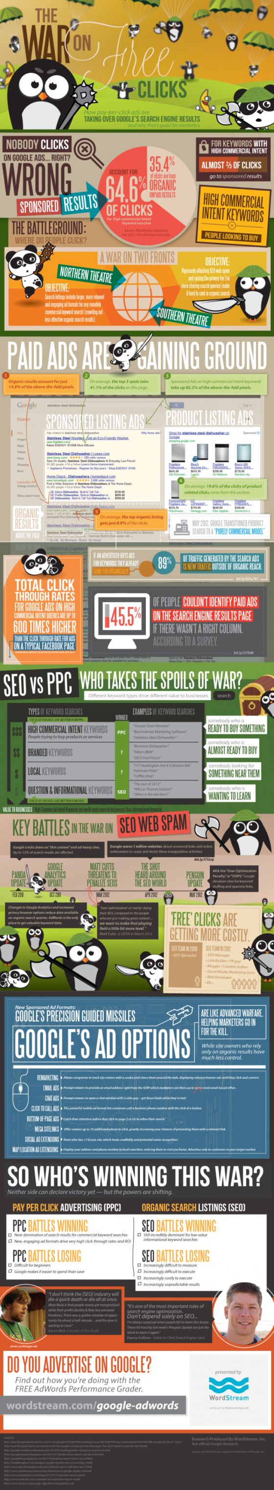 Pubblichiamo oggi una nuova infografica realizzata da Wordstream dal titolo “The War On Free Clicks”, che può essere considerato un nuovo capitolo della saga sulla guerra stella per il posizionamento sui motori di ricerca, e sulle migliaia di considerazioni fatte sui risultati prodotti dalla ricerca organica. Vediamola in dettaglio.