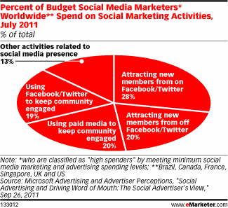 Se guardiamo ai budget che i marketers contano di investire nel mercato dei social media è possibile intuire in che modo stiano cercando di alimentare le loro comunità on line. Le aziende affermano che il 48% del loro budget viene usato per attirare nuovi membri alle proprie pagine, di questo il 28% si concentra su social network quali Facebook o Twitter, e il 20% altrove.