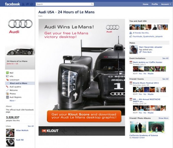 Audi USA è stato uno dei primi brand ad integrare il Klout Score sulla sua pagina Fan di Facebook, permettendo agli utenti di guadagnare uno sfondo del desktop o una suoneria in base al risultato.