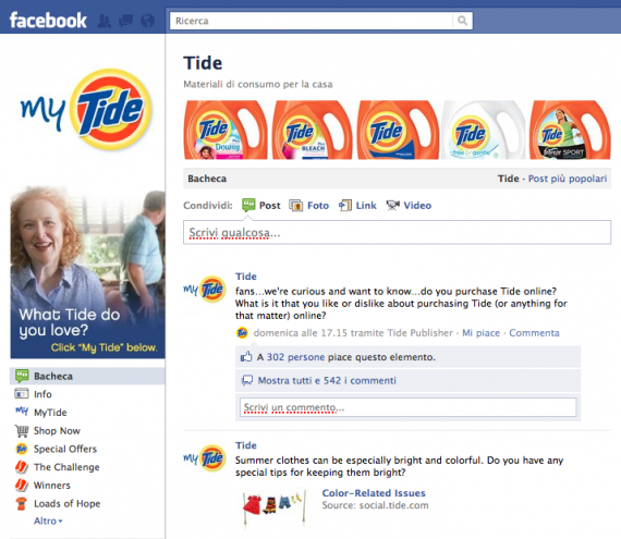 Se non vendete nuovi computer o smartphone, come fate ad attirare l’attenzione? La soluzione suggerita da Jeremiah Owyang, partner di Altimeter Group, è quella del “salire a livello del lifestyle: ad esempio, può essere difficile entusiasmare le persone parlando di un nuovo detergente, ma l’idea di mantenere la casa pulita e priva di germi è qualcosa che può coinvolgere le perosone. Questo è quello che ha fatto Lysol, lo spray disinfettante, che in passato ha raggiunto oltre 460,000 fans su Facebook e li ha coinvolti conversando con loro e dando alcuni suggerimenti su come fare le pulizie. Ed quanto sta facendo Tide, puntando sull’engagement e il dialogo volto alla co-creazione: guardate che bella fanpage.
