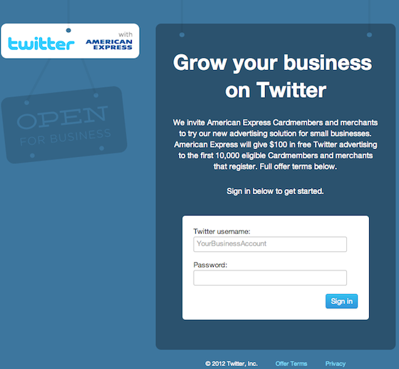 L’iniziativa nascerà in collaborazione con American Express per i titolari di una carta del marchio, a breve una selezione di commercianti con sede negli Stati Uniti saranno invitati a provare la nuova soluzione pubblicitaria, per incentivare l’azione American Express offrirà 100 dollari in pubblicità gratuita per le prime 10.000 imprese che risponderanno positivamente alla chiamata. Nel frattempo a questo indirizzo https://ads.twitter.com/amex potrete visitare la pagina di accesso che le aziende americane useranno per partecipare alla selezione dei primi 10.000. Non ci resta che attendare che l’iniziativa venga estesa ad altri paesi al di fuori degli Stati Uniti.